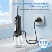 Batterie au lithium de dernière technologie intégrée, le nettoyeur de dents à eau rechargeable par USB va durer jusqu’à 21 jours d’utilisation continue après une charge complète en seulement 4 heures. Le câble USB est inclus.